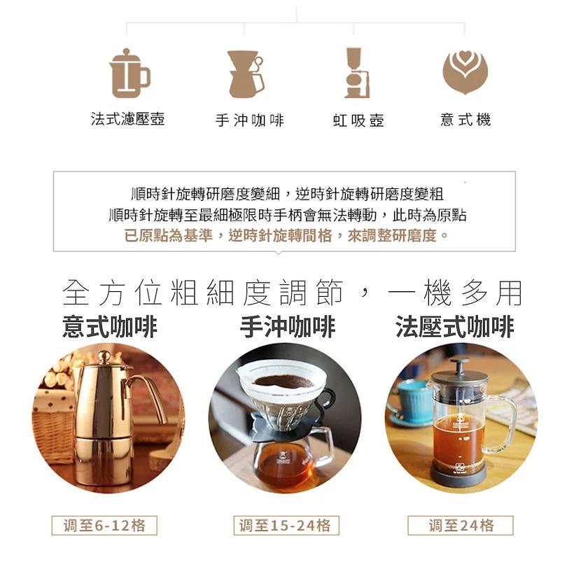 手磨器的另一個優點是由CNC不銹鋼製成的錐形刀盤,結合雙軸承固定中軸,研磨更穩定勻均。